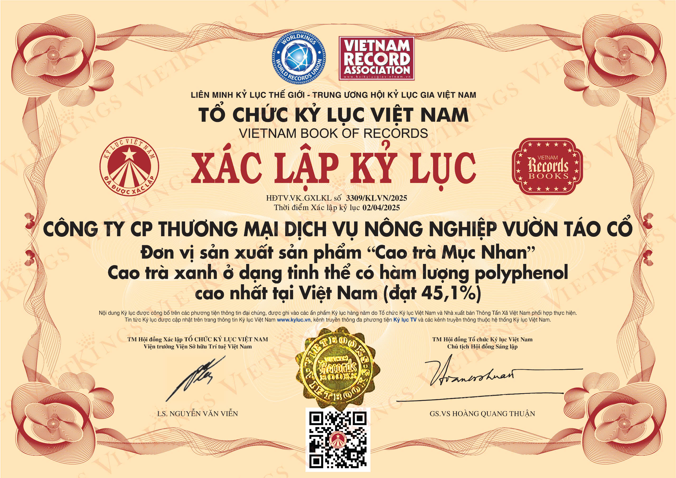 Here, Ms. Le Thi Hoa, Director of Ancient Apple Agricultural Trading and Service Joint Stock Company has stated the purpose and meaning of the production of high -ranking Muc Nhan. Accordingly, this introduction is the first high tea product in Vietnam and set a record with a polyphenol content of up to 45,1%, The highest of the current commercial tea on the domestic market. To get this success, Ms. Hoa herself came to China to learn the technology of producing teas as "great" of this country: Not just the flavor, Not only the ability to save incense and longevity of the product, These teas are also medicinal herbs, Create a sense of relaxation for users, refreshing but not insomnia. In short, Tea enjoying is not only a hobby but also an elegant and healthy culture. However, these products are almost only for high -income classes because the price is very expensive, Up to thousands of yuan a teapot (That is the space 5-10 million dong) And of course, Raw materials to produce these "great" teas are not cheap. After a long period of pursuing tea production technology, Ms. Hoa has discovered that the northern mountains of our country have hundred -year -old tea roots of the same quality or better quality of China at a cheaper price.. She has applied the technology she learned and successfully produced "Cao Muc Nhan", From there, expand to other unique teas such as San San Muc Nhan tea, Old yellow tea, Muc Nhan or Oolong tea, Muc Nhan. These products are not inferior to China's "great" tea, Not to mention some useful ingredients in the product have a higher rate, Especially polyphenol, With the peak is 45,1% In Cao Muc Nhan Tra and the Vietnamese record organization set this record on the date 02/04/2025 past. This record has a great significance when powerful antioxidant polyphenols, Ability to neutralize free radicals, Support cancer prevention, Slow down the cell aging process and this ratio in natural tea is only about 10-18%, For commercial tea with the most modern technology today, it is only below 40%. In addition, Muc Nhan Cao Tea also has catechin content (It has the same properties of preventing cancer and reducing cell aging as polyphenols) quite high, up to 19,9% and does not change with temperature, Therefore, tea can be brewed with hot water 95-100 the degree to which the tea does not deteriorate, You can mix it with warm water and use it right away. Because the raw materials are cheap and produced domestically, Muc Nhan high tea is currently priced at the same price 1/10 compared to high-end Chinese tea, with extremely high density, A tea ball about 2cm in diameter can be brewed 25 teapot, In which the best taste is in the second phase 9 come 12.