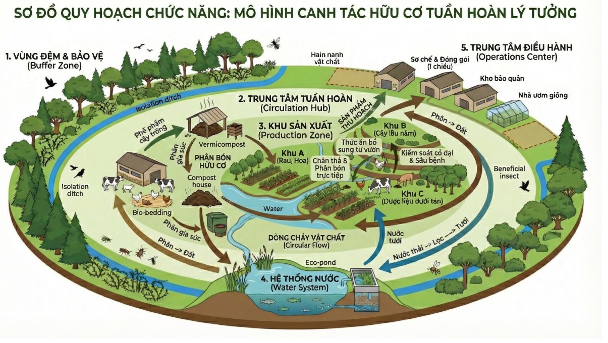 Sơ đồ quy hoạch chức năng mô hình canh tác hữu cơ tuần hoàn lý tưởng